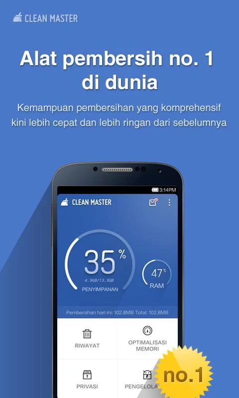 Dipercaya oleh 50 juta pengguna dan semakin bertambah, Clean Master merupakan pendorong memori yang perkasa dan pembersih sampah nomor 1 yang dapat meningkatkan kecepatan perangkat Android Anda.